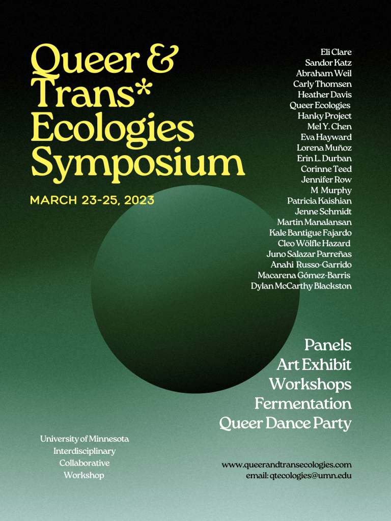The symposium is sponsored by the UMN College of Liberal Arts Queer and Trans Ecologies Interdisciplinary Collaborative Workshop and made possible with an Imagine Fund Special Events Grant. Our generous co-sponsors include the UMN Institute for Advanced Study; Critical Disability Studies Collective; RIDGS (Center for Race, Indigeneity, Disability, Gender & Sexuality Studies); the Liberal Arts Engagement Hub; the Environmental Humanities Initiative; the Departments of American Studies, Anthropology, Art, Gender Women & Sexuality Studies, and Geography; and the Department of Forest Resources DEI Committee.